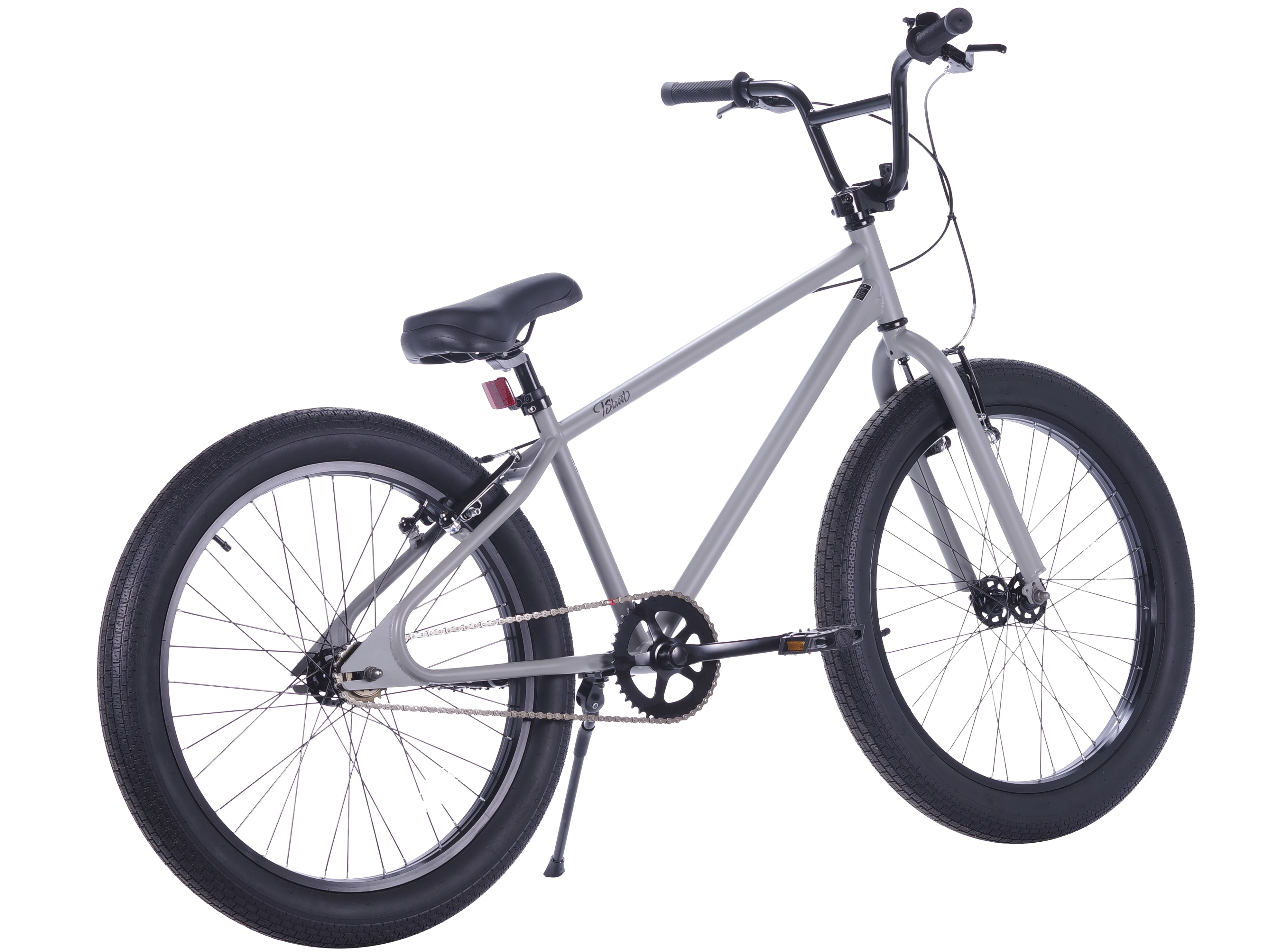 T Streetのコンセプト「ストリートワイズでかっこよく、よく走る自転車」を煮詰めて、 24x3.0のセミファットタイヤを履いたBMXに辿り着きました。熟考したジオメトリーのおかげでシングルギアなのにひと漕ぎでスーッと進みます。 さらにハブ周りを良いもので固めて、タイヤの転がり抵抗を抑えたので軽く走る自転車が出来上がりました。